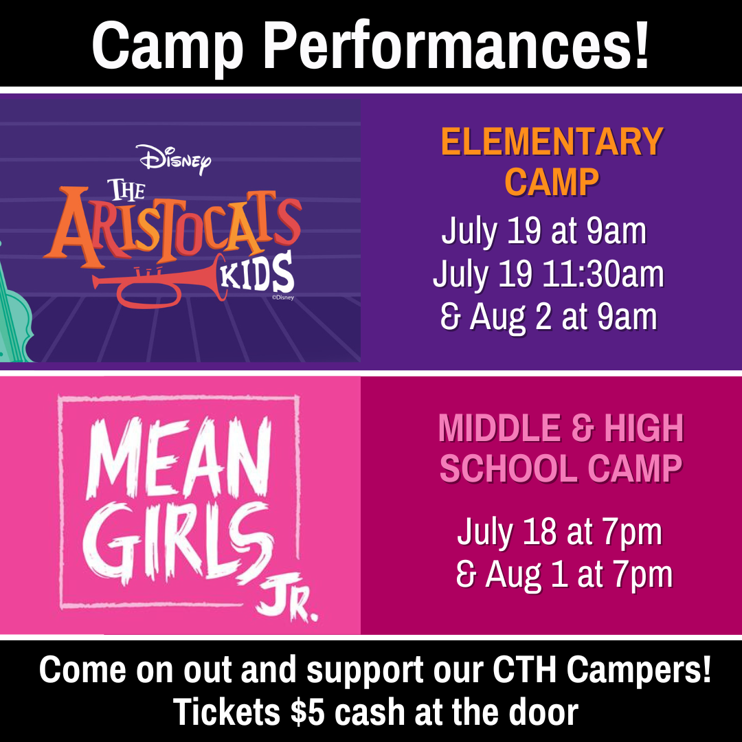 The camp scholarships will provide financial assistance for students ages 5–18 to attend a CTH Summer Theatre Camp and gain hands on experience in musical theatre, acting, dance, voice and technical production. Scholarships will be awarded based on financial need with preference given to active members of CTH.